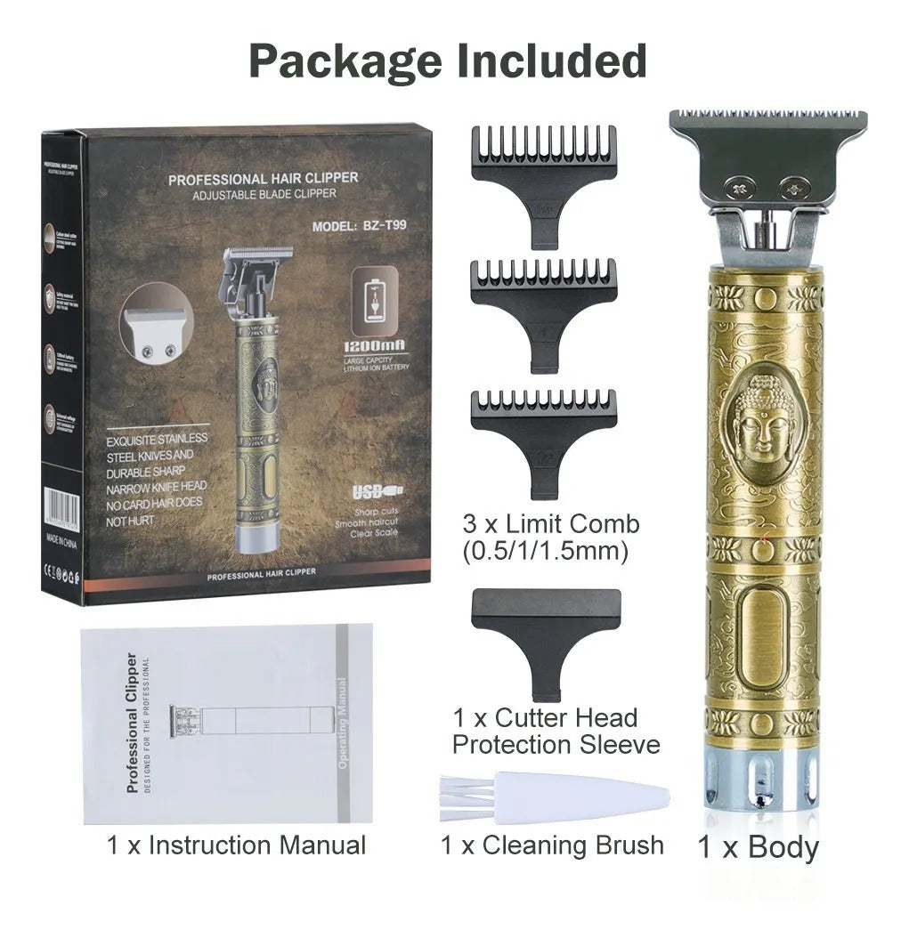 Incluye 3 peines guía (1mm, 2mm, 3mm), un adaptador de carga y un cepillo de limpieza para mantener el equipo en perfecto estado.